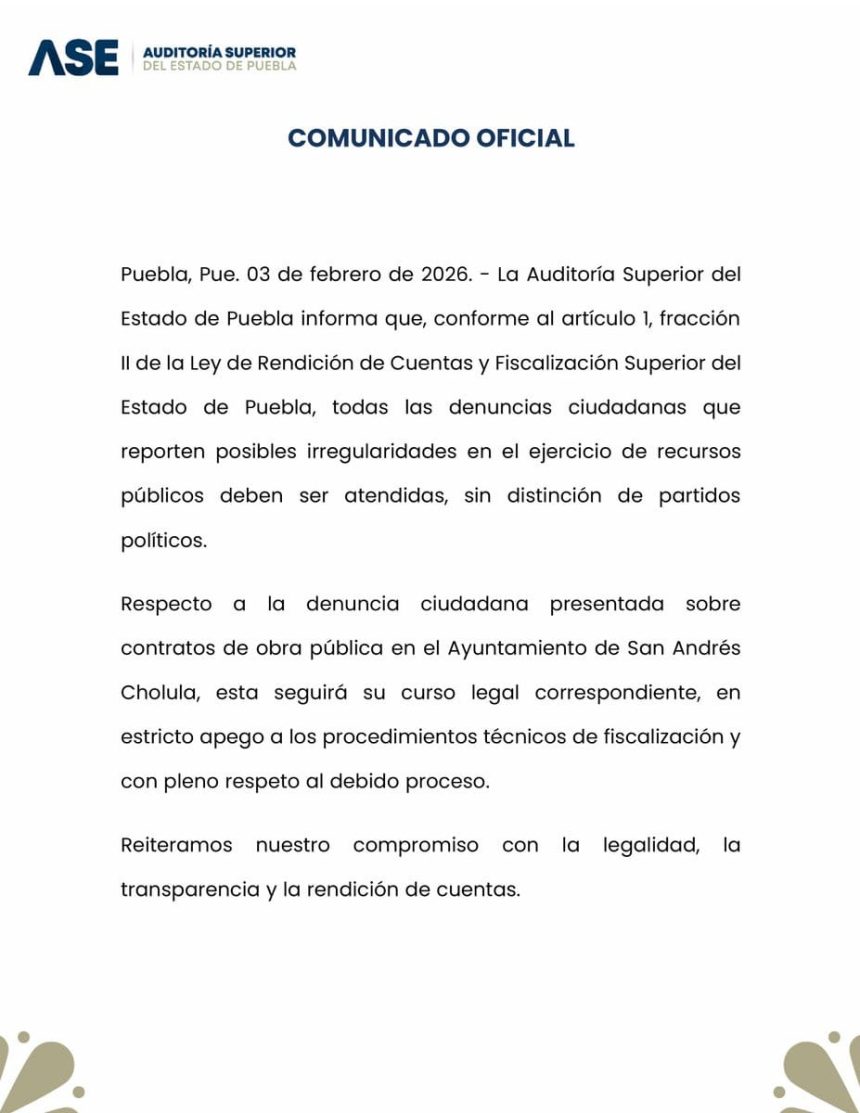 A través de un comunicado oficial, la ASE precisó que la denuncia ciudadana relacionada con contratos de obra pública en el Ayuntamiento de San Andrés Cholula continuará su curso legal correspondiente, en estricto apego a los procedimientos técnicos de fiscalización.
