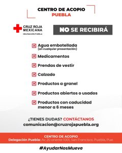 Con la finalidad de contribuir al envío inmediato de ayuda humanitaria hacia las comunidades perjudicadas por las intensas lluvias, la Delegación de Cruz Roja Mexicana en Puebla apertura un Centro de Acopio que comenzará a operar este martes 14 de octubre, permaneciendo activo el tiempo que la situación lo requiera.