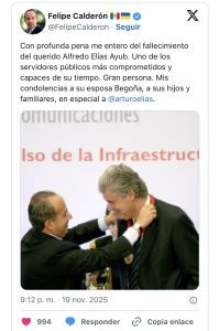 “Mis condolencias a su esposa Begoña, a sus hijos y familiares, en especial a Arturo Elías Ayub”, escribió Calderón, recordando a Elías Ayub como “uno de los servidores públicos más comprometidos y capaces de su tiempo”.